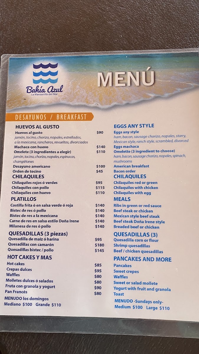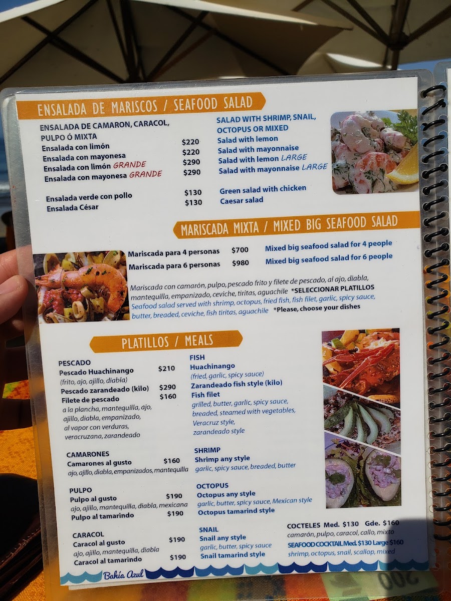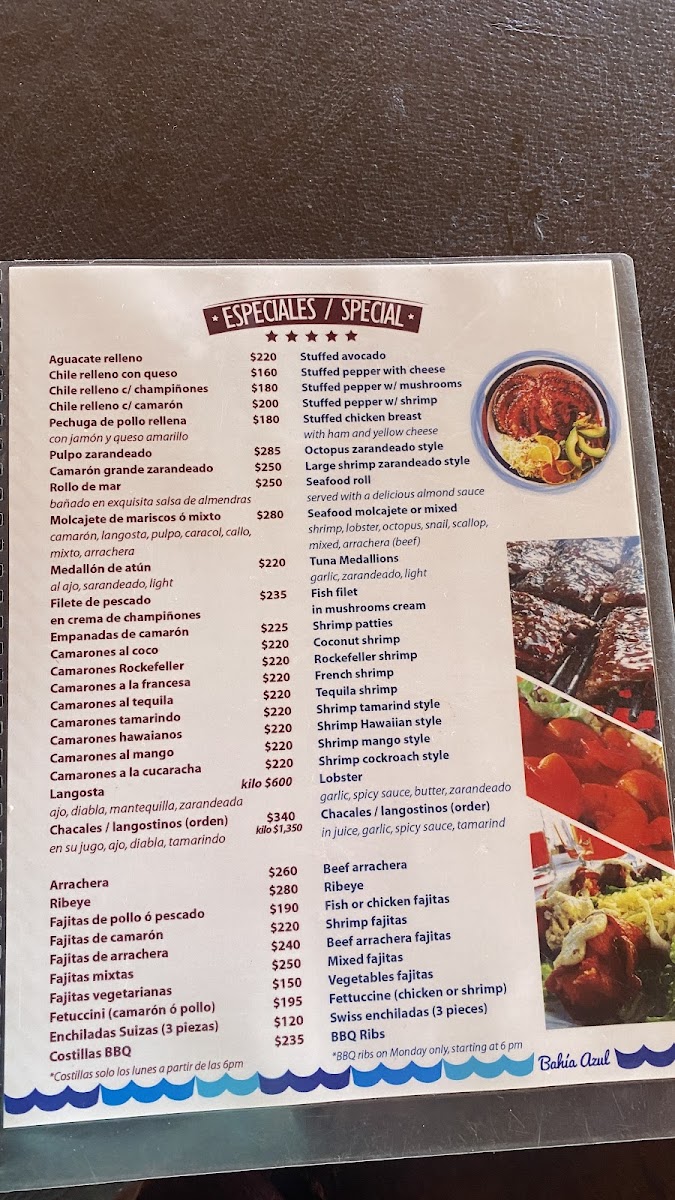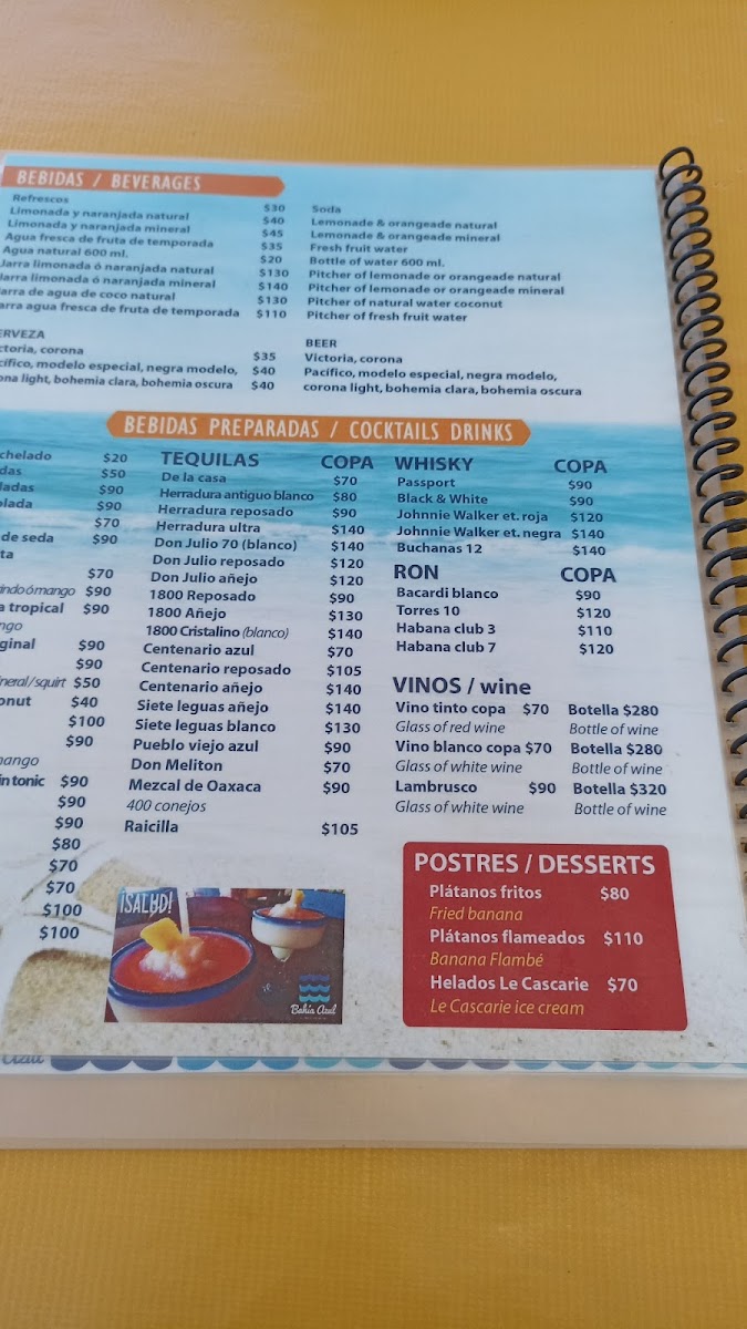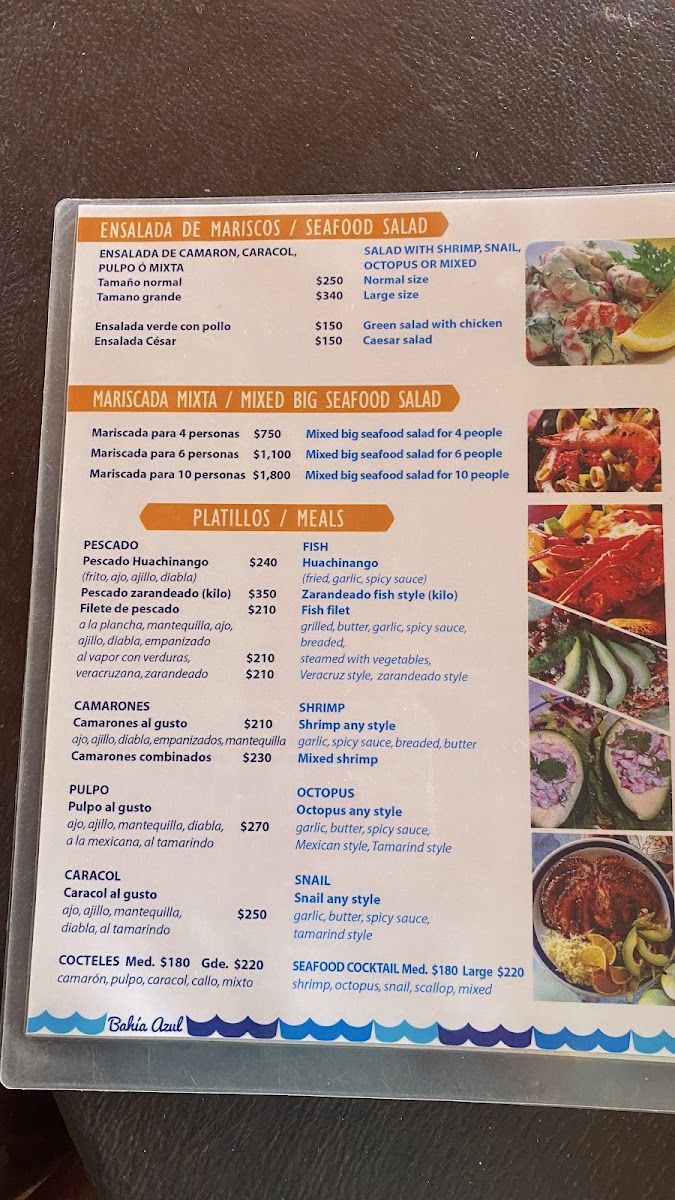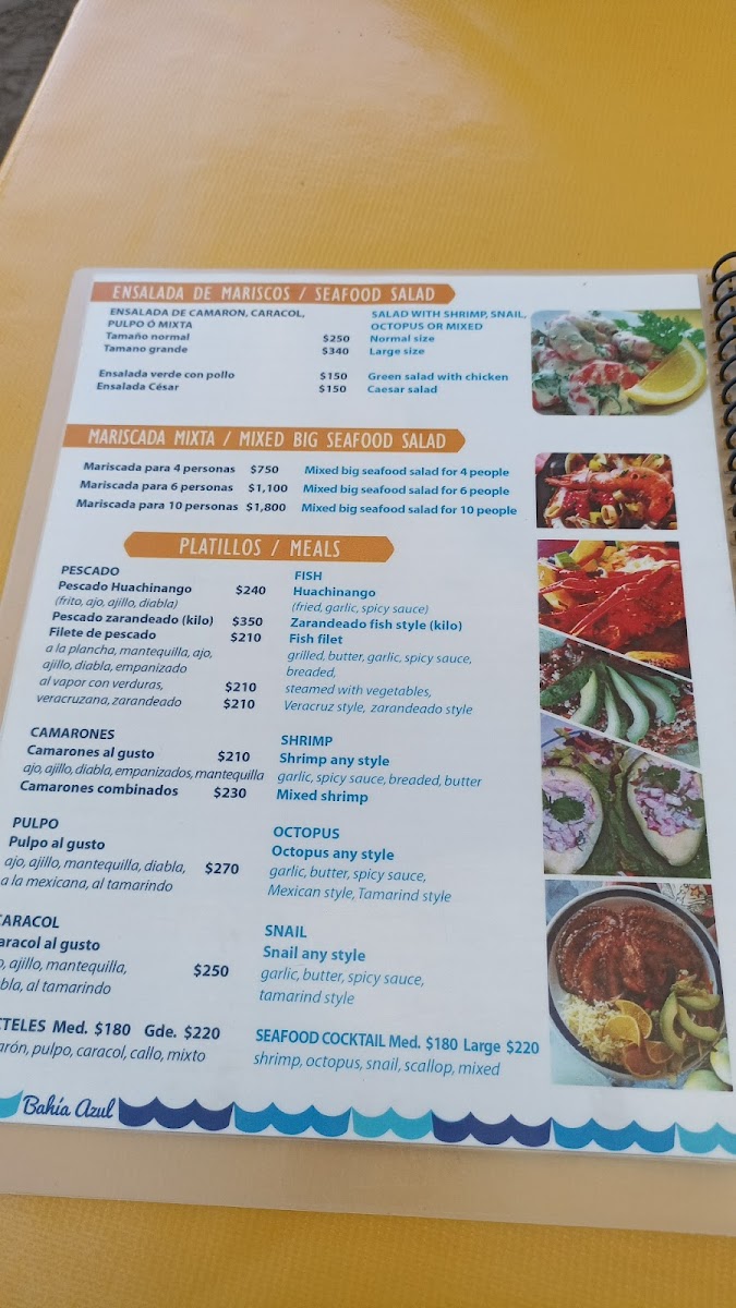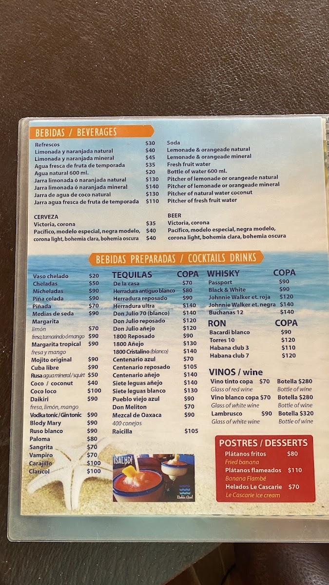 The menu offers a variety of seafood and Mexican dishes, featuring both traditional and regional preparations. It is organized into several categories that include appetizers, main courses, and beverages, allowing visitors to choose from light bites to more substantial meals.